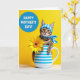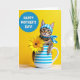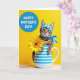 This card shows a small tabby cat peeking out from a white mug with wide blue horizontal stripes, its striped paws resting on the rim as if leaning in for a closer, friendly hello. The cat’s amber-brown fur and long whiskers are set off by emerald-gold eyes, and it wears a blue-and-white checkered headscarf tied neatly with a matching neckerchief that feels like a sweet, thoughtful touch ❤️. A sunny yellow background fills the scene, giving everything a warm glow and making the cool blue accents stand out. To the right of the mug, a large yellow flower opens like a gentle gift, adding a soft note of affection between the cozy cat and the viewer 🌼. Light falls evenly across the ceramic and fur, showing smooth glaze on the mug and the fluffy texture around the cat’s cheeks. In the upper left, a solid blue circle holds the message in light-colored lettering, clearly separated from the main illustration for easy reading. The blue circle sits against the yellow background above the mug, while the bright flower’s petals stretch outward beside the cat.