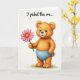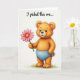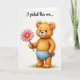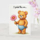 This design shows a small bear-like character with golden-orange fur standing upright against a bright white background, its round face and wide eyes giving it a tender, friendly look ❤️. Soft pink blush warms its cheeks and the insides of its perked ears, as if it’s shyly offering attention to someone just off to the side. It wears simple baby-blue undergarments that add a gentle cool contrast to its warm coat. Near its feet, a few short tufts of green grass suggest a tiny outdoor patch without crowding the open space. In its left paw, it holds a pink daisy-like flower with many neat petals circling a sunny yellow center, presented carefully like a small romantic gesture 🌼. The words “I picked this one...” appear as a flowing line of text across the upper area in a medium pink tone that matches the flower. Light shading along the fur and petals gives a soft, touchable texture, and the flower’s stem angles slightly upward from the paw toward the center of the card.