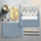 This elegant wedding suite features delicate floral and foliage designs in a dusty blue and gold color scheme for a cohesive and stunning wedding theme. The matching envelope shown here showcases a sweet floral pattern interior and dark dusty blue exterior. A template has been provided to add your initials and return address easily on the back flap. Search ID1045 to see other products in this wedding design set.
