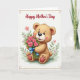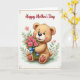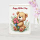 This design shows a light-brown teddy bear sitting at the center, holding a bouquet close as if offering it to someone special ❤️. Its round face has soft rosy cheeks and large dark eyes that seem to linger with a tender, affectionate look. Gentle, diffused lighting gives the fur a cozy texture and keeps the scene calm and inviting, like a quiet moment shared between close friends or partners. The bouquet features blush-pink roses with small pink blossoms tucked in, surrounded by leafy green sprigs that add a fresh garden touch 🌼. A smooth blue ribbon ties the stems, creating a sweet contrast against the warm brown tones of the bear. Around the illustration, a rustic parchment-like border frames the scene like a keepsake. At the top, a short line of text sits centered in deep red lettering.