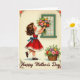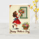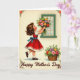 This design shows a young girl with curly brown hair and rosy cheeks standing on tiptoes as she offers a colorful bouquet up to an open window, her lifted chin and intent gaze adding a gentle, affectionate tone ❤️. She wears a red dress with a white collar and a blue bow at the waist, giving the scene a classic, storybook look. The window frame is deep green, and beyond it sits a pale blue sky with soft, scattered clouds that makes her gesture feel airy and tender. In her hands, the flowers mix pink, orange, yellow, purple, and fresh greens, arranged like a bright little celebration. A second container of matching blooms rests near the bottom, echoing the gift she’s presenting and adding a cozy, cared-for feel 🌼. Small floral decorations sit in the corners, guiding your eye down the page without crowding the main scene. The words “Happy Mother’s Day” are placed along the bottom in dark lettering that stands out clearly against the light background. The green-framed window and the cloud-dotted sky sit above her bouquet, while the corner flowers quietly border the edges.