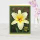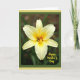 This card features a close-up of a six-petaled flower in the center, glowing in sunny yellow with creamy edges that fade into a richer golden middle 🌼. The petals curl outward with fine lines and soft texture, like a gentle touch shared between close friends. In the flower’s heart, orange-red stamens stand upright, adding a warm contrast that feels affectionate and welcoming ❤️. Behind the bloom, the background falls into a blurred mix of deep greens and muted earth tones, keeping the focus on the flower’s tender glow. Soft, diffused light brushes across the petals, creating small highlights and a calm, intimate atmosphere. The words “Happy Mother’s Day” appear in bright yellow lettering at the lower right corner, echoing the flower’s main color. A thin inner border in deep forest green sits just inside a wider outer border in pale yellow.