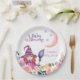 Sweet Flower Witch Cauldron Baby Brewing Shower Paper Plates, design feature watercolor flower witch, cute pink half moon, floral botanical, witch's broom and " A Baby is Brewing" wording. cute and sweet funny spooky baby shower Paper Plates for baby expected in Halloween, October, Fall and Autumn themes. you can personalize your own text. it's good for girls. Pink and Purple theme