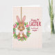 This card features a sweet, stylized forest animal with long pointed ears and soft brown fur, gazing outward with wide eyes and a small, tender smile that suggests a gentle, friendly connection 🐰. It wears a light pink-and-white striped top and sits calmly inside a round floral wreath. The wreath is packed with small pink blossoms and fresh green leaves, arranged to feel like a spring garden gathered into a circle 🌷. A thick, braided rope hangs down above the wreath, adding a cozy, textured detail against the smooth illustration style. The main character and wreath sit on the left side, leaving open space on the right for the greeting. The greeting text is placed on the right in flowing cursive-style lettering, colored in a darker pink tone that stands out from the background. Behind everything is a soft peachy-pink backdrop with a faint grid pattern, and the rope appears to suspend the floral circle near the top edge.