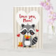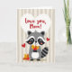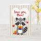 Designed with a sweet woodland animal at the center, this digital illustration shows a gray-and-white creature with a dark mask-like marking and a ringed tail looking forward with wide eyes and a gentle, caring smile ❤️. Behind it, the background is softly textured with pale vertical wavy stripes that keep the focus on the character. Above the head, a white heart-shaped speech bubble holds the message “Love you, Mom!” in red lettering, placed prominently near the top. The animal cradles a small bundle of fall leaves in gold and russet tones, dotted with bright red berries, as if offering a thoughtful gift. Two small deep-red hearts float on either side, adding a quiet romantic warmth to the scene. The mix of soft neutrals and rich autumn colors creates a cozy, affectionate look without feeling busy 🌼. The heart bubble is crisp white with the red text centered inside, and the two smaller hearts sit at mid-height to the left and right of the character. Pale cream stripes ripple vertically across the background from top to bottom.
