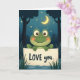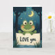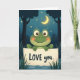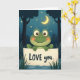 Designed with a sweet cartoon frog in bright green, this card shows it popping up from a calm wetland at night. The frog has big brown eyes, a gentle smile, and a soft pink blush on its cheeks that makes it look a little shy 🥰. It’s holding an off-white sign close to its chest, like it’s offering it to someone special. On the sign, the words “LOVE you” appear in simple, hand-drawn lettering, with “LOVE” in larger letters and “you” smaller underneath, placed right in the center of the card. Behind the frog, a crescent moon hangs in a dark sky, and small golden dots glow like fireflies. Shadowy trees and tall reeds sit around still water, giving the whole scene a quiet, private feel. It’s a meaningful card to give because it says what you feel in a gentle, direct way, whether it’s for romance or close friendship ❤️.
