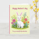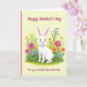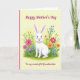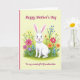 This card shows a fluffy white rabbit-like creature sitting calmly in a garden, with soft pink inner ears, dark shiny eyes, and a small smile that feels like a gentle hello ❤️. Around it, stylized flowers crowd in close like friendly companions, with petals in pink, purple, yellow, orange, and blue that seem to lean toward the center. The green grass beneath is textured and layered, giving the scene a cozy, tucked-in look as if the little animal is being cared for by the blooms. A pale yellow background washes the whole image in a sunny glow, keeping the focus on the creature and the ring of blossoms. Along the left edge, a narrow pink border with a delicate repeating pattern adds a sweet decorative touch 🌼. Any greeting text sits near the top in a simple pink tone, standing out clearly against the light background without overpowering the artwork. The rabbit-like figure is centered, with the brightest flowers clustered near its sides to guide your eye back to its tender expression. The left-side border remains a soft pink strip with tiny patterned details running vertically from top to bottom.