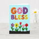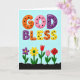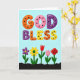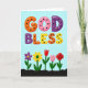 This greeting card features the large words “GOD BLESS” across the top, set in chunky, rounded letters that look slightly raised like soft candy shapes. Each letter is filled with a different bright color—orange, pink, purple, and yellow—and dotted with small black spots that add a sweet, affectionate touch ❤️. The background is a pale sky blue, giving the message lots of open space to breathe and feel gentle. The text sits centered and wide, with the phrase spanning most of the upper half of the design. Along the bottom, a dark horizontal strip grounds the scene like a garden bed, and thin green stems rise from it. Five stylized flowers stand in a row, including a purple multi-petal bloom with a yellow center, a red tulip, a pink dotted flower, and a tightly curled red rose that reads like a quiet sign of closeness 🌼. The flowers are arranged evenly from left to right, with simple shapes and bright petals against the dark base band.
