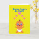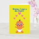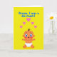 This card shows a stylized cartoon baby near the bottom center, with warm peach-toned skin, a white diaper, and tiny black hair tufts. The baby’s big blue eyes and rosy cheeks pair with an open smile, and its arms stretch outward as if reaching up for a hug ❤️. Across the upper half, a chunky blue message reads, “Grama, I wuv u dis much!” with the words arranged in two lines. The lettering sits clearly against a bright yellow background, making the message easy to spot at a glance. Between the text and the baby, several soft pink hearts float upward, like little signals of affection drifting through the space. The simple shapes and gentle colors give the scene a sweet, friendly tone, as though the baby is beaming up at someone just off the page 🌼. The yellow field stays solid and uncluttered, with the pink hearts scattered above the baby’s head and below the blue text.