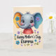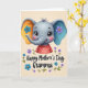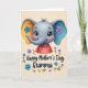 Designed with a gentle, stylized elephant at the center, this card shows a sweet face with large shiny eyes, long lashes, and rosy cheeks that seem to glow with affection ❤️. Its trunk curls upward like a friendly hello, and a tiny tuft of hair adds a youthful touch. The oversized ears create a cozy, affectionate look—one ear has an orange inner area with a blue flower, and the other has a blue inner area with a purple flower, like a tender mismatch that feels lovingly chosen. The elephant wears a red top dotted with small white circles, giving it a cheerful, caring presence. Beneath the character, the text “Happy Mother’s Day Gramma” sits centered in a flowing handwritten-style font, shown in a light tone with a soft glow for easy readability. Around the wording, a loose wreath of blue and purple blossoms with small green leaves and curling tendrils frames the message, adding a garden-like softness 🌼. The background stays a creamy off-white, making the red shirt, bright ear colors, and floral accents stand out clearly.