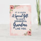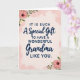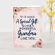 This card features a soft blush-pink background with gentle watercolor-like texture that feels like a warm embrace ❤️. Centered on the front is the message “IT IS SUCH A Special Gift TO HAVE A WONDERFUL Grandma LIKE YOU,” arranged in mixed lettering styles for a tender, affectionate look. The phrases “IT IS SUCH” and “TO HAVE A WONDERFUL” appear in dark navy, all-capital letters that sit firmly near the top and midsection of the layout. “A Special Gift” and “Grandma” are written in a flowing, cursive-style lettering that curves softly through the center, adding a touch of closeness like a hug. The remaining words are set in smaller, coordinating dark navy text that completes the lines beneath, keeping everything easy to read. In the corners, small floral clusters suggest quiet appreciation, like someone leaving fresh blooms on a kitchen table 🌼. Peachy-pink blossoms mix with tiny white and pale yellow flowers among fresh green leaves, with slender stems reaching inward from the edges.