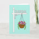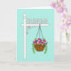 This card features a decorative signpost on a calm aqua background, with a crisp white post and a classic cap standing on the left. A matching white sign extends to the right, held by a curling bracket, and it carries the word “GRANDMA” in cutout-style letters that stand out clearly. The lettering sits centered on the sign and reads left to right, guiding your eye toward the hanging basket below. A simple black chain supports an ornate brown basket, and the gentle curve of the metalwork adds a tender, caring touch ❤️. The basket is filled with mixed flowers in sunny yellow, magenta, purple, red, and white, nestled among lush green leaves for a cozy, garden-fresh feel 🌼. A few trailing green vines spill over the rim, suggesting a soft, affectionate flourish, like a garden tended with patience. The white sign and post contrast sharply against the aqua field, while the brown basket and multicolored blooms create a bright focal point beneath the text. Fine decorative arches on the basket’s sides and the cascading vines are visible against the flat aqua background.
