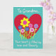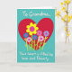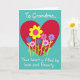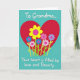 This card features a large crimson heart centered on a light teal background, creating a sweet contrast that feels like a warm hug ❤️. From the bottom of the heart, seven simple flowers rise upward, as if they’re being gently held close in a caring embrace. The tallest bloom is sunny yellow with a magenta center, while the smaller flowers mix soft pink, sky blue, and light lavender petals, each with a bright pink core. Lime-green stems and leaves curve upward with an easy, friendly flow, suggesting a tender, growing bond between loved ones 🌼. Near the top, the words “To Grandma…” appear above the heart in a smooth, rounded style, set in a dark tone that stands out clearly. Along the bottom, the phrase “Your heart is filled by love and Beauty” is placed in white lettering, centered and easy to read against the teal. The overall look stays flat and simple, keeping the focus on the affectionate heart-and-flowers scene. The heart’s red shape sits solidly in the middle, with the flower tips reaching up toward its lower edge and the text anchored above and below.
