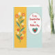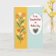 This design shows a bright golden-yellow vertical panel on the left, like a sunny strip that sets a cheerful tone. Rising from it is a simple green stem with rounded leaves, topped by small daisy-like flowers in white, orange, and deep red that feel like a gentle bouquet offered with care ❤️. The right side shifts to a pale aqua background with faint diagonal lines, giving the space a soft, calm look. Near the center sits a white oval bordered by a ring of small terracotta-orange dots, like a delicate frame. Inside the oval, the message “To my Grandmother on Mother’s Day” is placed in red lettering, centered and easy to read. Below the words, a large teal heart holds a smaller red heart, suggesting a close bond and steady affection 🌼. A matching border of terracotta-orange dots repeats around the outer edge, tying the yellow and aqua sections together. The flowers lean slightly toward the text area, with the hearts positioned directly beneath the line of red lettering inside the oval.