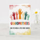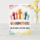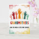 This card features seven raised hands shown as colorful silhouettes reaching upward together, suggesting closeness and support like a group hug ❤️. The hands move through a rainbow of tones, including blush pink, deep red, orange, and cool teal, all set on a bright white background. Centered beneath the hands, the word “GRANDMOTHERS” appears in large uppercase letters, with each letter matching the hand colors in the same order. Below that, a smaller line of text reads “MAKE THE WORLD A LITTLE MORE COLORFUL.” in a dark, easy-to-read type, placed neatly near the lower center. The upward gesture and coordinated colors create a sweet, affectionate energy, like friends or family cheering each other on 🌼. Around the main artwork, faint watercolor circles hover like soft bubbles, adding a gentle, dreamy frame without crowding the design. The circles fade from warm reds and oranges near the top into calmer greens and yellows toward the bottom edge.