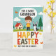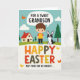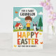 This design shows a smiling young boy with neatly combed brown hair standing beside a black-and-white dog with pointed ears, their close stance and gentle expressions suggesting loyal friendship 🐇. The boy wears a yellow top with red sleeves, dark pants, and blue shoes, keeping the figures easy to spot at a glance. Behind them sits a small cream-colored house with a red roof, surrounded by green grass and simple evergreen trees that frame the scene like a cozy yard. The sky is pale blue with soft white clouds, and a few orange and golden butterflies drift overhead, adding a springtime touch 🌷. Above the boy, a rounded speech bubble holds the message “FOR A SWEET GRANDSON” in dark lettering that stands out clearly against the light bubble. Near the bottom, “HAPPY EASTER” appears in large letters with alternating orange, yellow, and red fills, arranged in a straight line across the page. Just beneath that, the smaller line “MAY YOUR DAY BE BRIGHT…” is placed in a darker color for contrast. The butterflies sit near the top edge, floating between the clouds in warm orange and yellow tones.