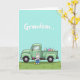 Designed with soft spring tones, this card shows a sage-green vintage-style truck sitting across the lower third on a field of stylized green grass. In the truck bed, six pastel oval eggs are arranged neatly, each with a different pattern like stars, stripes, and small floral shapes. Beside the front wheel stands a white bunny 🐰 with rounded ears, dressed in blue overalls, holding a bright pink tulip out in a gentle, offering pose that suggests quiet affection. The background is a smooth sky-blue, giving the scene lots of open space and an easy, airy look. Near the top center, the text “Grandson..” appears in white, set in a friendly hand-drawn look that stands out clearly against the blue. In the top-right corner, a simple yellow sun peeks in, adding a warm accent above the scene 🌷. The tulip’s petals are a strong pink, and the bunny’s paw wraps lightly around the green stem as it reaches toward the truck.