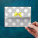 Stylish envelope done in a light gray and white polka dot pattern, with graphics of a little yellow bow, on the back flap. The inside has a sunny yellow and white polka dot pattern for a stylish contrast. Black return address, on the front, is ready to personalize to suit your needs. Lovely finishing touch to our matching Baby Shower Thank You note cards.