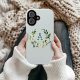 Custom monogrammed phone cases personalized with your initial or other text. This simple farmhouse inspired design features a watercolor wreath of greenery and white flowers on a mint polka dot background. Add your monogram letter in the botanical frame. Use the design tools to choose any background color, change text fonts and colors or add your own photos to create a one of a kind case design.