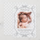 This sweet birth announcement features one vertical photo with a grey hand-drawn ribbon frame and light grey gingham pattern background. You can easily add another photo and text to the back if needed.