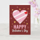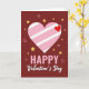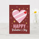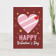 This greeting card features a large central heart filled with alternating stripes of bubblegum pink and white, like a sweet candy treat. A smaller crimson heart sits on the upper-right curve, edged with a faint silvery-white glow, adding a little extra “you and me” closeness ❤️. The background is deep maroon, setting a cozy evening tone that makes the hearts feel even warmer. Scattered around are tiny golden stars and white outline hearts in different sizes, drifting like little glances exchanged across the space 🥰. Below the big heart, the text reads “HAPPY Valentine’s Day,” with “HAPPY” in chunky pink letters and “Valentine’s Day” in flowing white lettering. The words are centered under the heart, with the pink line standing out first and the white line softening the look beneath it. Overall, the layout stays simple and balanced, with the striped heart taking center stage while the stars and outline hearts sprinkle the maroon background. The final look includes gold stars and white outline hearts floating around the striped heart on a rich maroon field.