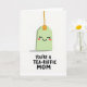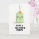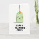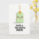 Designed with a bright white background, the card centers on a soft mint-green, rounded rectangle character that resembles a steeping herbal sachet, giving a sweet, friendly nod to closeness and care ❤️. Its face is simple but expressive, with gently curved smiling eyes, tiny lashes, a wide upturned mouth, and light rosy cheeks that suggest a bashful, affectionate mood. A thin golden-orange string rises from the top and connects to a small matching tab, adding a tidy accent above the character. A faint gray shadow sits underneath, grounding the figure and keeping the scene airy and uncluttered. Near the bottom, a short, chunky hand-drawn message is placed in dark lettering, reading like a pun that ties the image to a loving Mother’s Day note. The spacing leaves lots of open white space, so the character and words feel like they’re quietly sharing a private, caring moment 🌼. The overall palette stays gentle—mint green, warm orange-gold, soft pink, and charcoal text—so the design feels calm and affectionate. The text sits centered beneath the character in dark ink, with the mint figure hovering above it and the orange string extending upward.