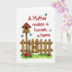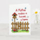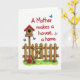 This greeting card features a white background with the line “A Mother makes a house, a home.” placed prominently near the top in bold red lettering, drawing your eye right away. Below the text, a gentle garden scene spreads out like a quiet backyard moment, with details that feel caring and close ❤️. On the left, a rustic birdhouse sits on a sturdy post, topped with a red roof and a dark round opening that suggests a safe little shelter. Along the bottom, a light wooden picket fence runs across the foreground, and a slightly open gate hints at a welcoming entrance shared between loved ones. A red rose rests on the gate, adding a soft romantic touch, while green grass at the base is dotted with small red and white flowers 🌼. A few pale blue and white butterflies flutter around the scene, giving it an airy, tender motion. The birdhouse roof is a deep red, and the fence boards show light texture with simple shading.
