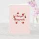 This Valentine's Day card features the sweet line “I love you Cherry much” right in the center. The text is in flowing cursive-style lettering, colored a warm red with a slight shadow that helps it stand out. Around the words, six shiny red cherries form a loose frame, each with bright highlights that make them look glossy. The cherries have short, curved green stems and small green leaves, adding a fresh pop of color. The background is a soft blush pink, which keeps the whole scene calm and romantic. The cherries sit around the message in an uneven circle, drawing your eyes back to the words and the cute pun. It feels light, affectionate, and perfect for someone you care about 💕❤️. Hope it helps you share your Valentine’s Day feelings in a kind, caring way.