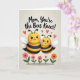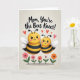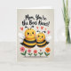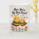 The front design shows a soft, textured cream background with two fuzzy, winged bee-like creatures centered close together, their rounded bodies leaning in as if sharing a gentle moment ❤️. The larger one stands slightly behind and beside the smaller one, giving a protective, caring feel through their cozy spacing and matching smiles. Both have bright yellow heads, black-and-yellow striped bodies, and light, translucent white wings, with tiny dot eyes and curved smiles warmed by a touch of rosy blush. Above them, several red heart shapes float upward, adding a sweet, affectionate tone without crowding the scene. Along the bottom edge, a row of simple flowers in blush pink, coral orange, and white sits on green stems, like a small garden border 🌼. A short Mother’s Day message is placed near the top in a darker ink color, centered above the characters so it’s easy to spot. The layout leaves plenty of open space around the figures, keeping the focus on their closeness and the hearts overhead. The flowers form a neat line across the lower portion, with alternating colors and small rounded petals.
