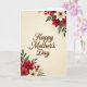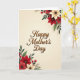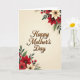 This greeting card features the words “Happy Mother’s Day” centered on the front in flowing, cursive-style lettering colored a warm brown, with a raised, embossed look that catches the light. The text sits comfortably in the middle, leaving space around it so the design feels calm and cared for, like a gentle hug ❤️. In the upper-right corner, a cluster of large, layered flowers leans inward, as if drawn toward the message with quiet affection. In the lower-left corner, a matching floral arrangement mirrors that movement, creating a diagonal balance that feels like a warm exchange between two friends. The blossoms mix deep crimson petals with creamy ivory blooms, some with darker centers, while rich green leaves add depth and a natural, garden-fresh feel 🌼. Small red berry clusters and slender twig-like sprigs weave through the foliage, adding tiny points of texture and color. Behind everything, the background is a soft cream that subtly warms toward the edges, with the floral clusters placed at the upper-right and lower-left corners around the centered brown greeting.