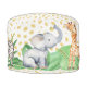A baby elephant, giraffe, cheetah, and lion are featured against a cute tan colored animal print pattern background along the side of this baby nursery pouf. The top and bottom feature a spotted animal print. Perfect for either a baby boy or a baby girl. Personalize with your first name at the top of the pouf.