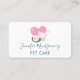A business card with an adorable graphic illustration. A white kitty cat with a cute paw print image on her fur. Sleeping peacefully. A big pink heart behind her and some little stars too. Mint green background.
