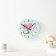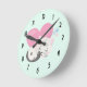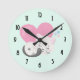 A clock with an adorable graphic illustration. A white kitty cat with a cute paw print image on her fur. Sleeping peacefully. A big pink heart behind her and some little stars too. Mint green background.