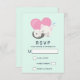 An RSVP card with an adorable graphic illustration. A white kitty cat with a cute paw print image on her fur. Sleeping peacefully. A big pink heart behind her and some little stars too. Mint green background.