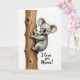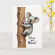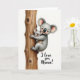 This design shows two cuddly koalas hugging close against a tall, earthy brown tree trunk, with the larger one holding the smaller in a protective, affectionate pose ❤️. Their fur is soft grey with gentle pink blush on the cheeks and inner ears, and their wide eyes add a tender, close-knit feel. The pair sits to the right side of the trunk, and their curved arms and legs wrap around the bark as if they don’t want to let go. The background stays plain white, giving the scene lots of breathing room and keeping attention on their quiet closeness. The larger koala looks outward with a calm, caring expression, while the smaller tilts its face up toward the bigger one like it’s seeking reassurance. Near the bottom of the card, a short message appears in a flowing, handwritten-style font in dark grey, reading “I love you, Mama!” 🌼. The trunk shows small knots and fine wood-grain lines running vertically.