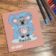 A cute salmon pink binder for children with a sweet cartoon gray koala bear on the front and some big polka dots on the back . Personalize it with the child's name and grade level or subject .