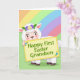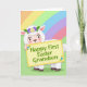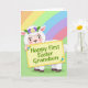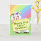 This card features a sweet, human-like lamb with fluffy white fleece and a gentle, affectionate gaze that feels like it’s meant for someone close 🌷. A small wreath of lavender, sage green, and creamy yellow flowers rests around its head, adding a soft, romantic touch to the character’s expression. The lamb holds a sunny yellow sign at chest level, angled forward as if offering it to a friend. The main message sits centered on the sign in green lettering, easy to spot against the warm yellow background. In the upper background, a pastel rainbow arches across the top in light orange, pale yellow, soft green, sky blue, gentle purple, and blush pink 🐰. Below, a light green ground stretches across the bottom, keeping the scene calm and airy with subtle shading around the lamb’s wool. Small blue flowers decorate the corners of the yellow sign, like tiny accents framing the text.