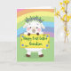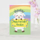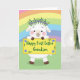 Designed with a sweet spring scene, this card features a fluffy white lamb-like character with rosy cheeks and dark, gentle eyes that seem to gaze at you like a close friend. A small wreath of green leaves and tiny violet-blue flowers rests on its head, adding a fresh garden touch 🌷. The character holds a bright yellow rectangular sign close to its chest, as if offering it with a tender, caring gesture. Centered on the sign is a short message in green lettering, with small blue floral details tucked into the corners. Behind the character, a soft pastel rainbow curves across the background, shifting from pinks and oranges into yellows, greens, and blues. The lower portion fades into a light green ground that reads like a quiet grassy field, giving the scene space to breathe 🐰. The rainbow’s arc sits above the character while the yellow sign stands out in the middle, framed by the pale green landscape below.