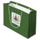 Minimalist watercolor christmas tree gift bag with playful leopard pattern in earthy green and gold. Personalize with your custom name for a stylish Christmas gift presentation.