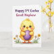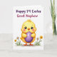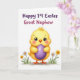 This card shows a fluffy yellow chick centered on a white background, with soft shading that makes its downy texture feel gentle and real. Its big dark eyes, tiny lashes, and rosy cheeks give it a tender, friendly look, as if it’s sharing a quiet moment with the viewer 🐰. The chick holds a speckled lavender egg close to its chest, and the close hug adds a sweet, affectionate tone without needing any extra characters. Above the illustration, a short greeting sits near the top in rounded lettering, using dark purple with touches of lighter magenta for contrast. The text is spaced neatly so it doesn’t crowd the artwork, leaving plenty of airy white space around the chick and egg. Along the bottom edge, small spring flowers and thin green blades frame the scene, adding a gentle garden setting 🌷. Tiny white and sunny yellow blossoms sit among the soft green stems beneath the chick.
