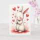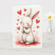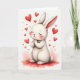 This card shows a fluffy white bunny-like character centered on a soft, watercolor-style red puddle of color, with its round body tucked in as if settling into a cozy moment 🐰. Its eyes are closed and a small smile lifts its face, while its tiny paws press together like it’s making a sweet wish for someone close. Rosy cheeks and a light pink blush along the long ears add a tender, affectionate look, like it’s thinking of a dear friend. A trail of cherry-red hearts floats upward around the character, some small and some larger, creating a gentle sense of motion and closeness 🐇. The lighting stays soft and hazy, giving the fur a cloudlike edge against the warm reds and pinks. Near the top, a short greeting sits centered in rounded lettering, colored in deep red to match the hearts. The hearts are painted with slightly feathered edges, drifting up and outward from the bunny’s head.