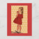 This vintage image has a sweet little blond girl dressed in red. She is about to take a bite out of an apple. The background is yellow with white hearts with a red border. See my store Art by MAR for matching products with this design.