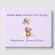 A cute teddy bear hanging on to a bunch of colorful balloons flies through the clouds with a couple of stars overhead. All text can easily be changed to your information.
