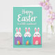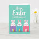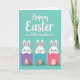 This greeting card features a wide teal background that feels like early spring, with a large white greeting across the top and a smaller supportive line tucked just beneath it. Below the text, three small white bunny characters with long ears and rosy cheeks peek over bright rectangular shapes, leaning in close as if sharing a friendly secret 🐰. One bunny gives a gentle wink, another wears a calm smile, and the third looks outward with an open, welcoming gaze that suggests warm affection. Each bunny stands above an egg shape near the bottom, adding a sweet, romantic touch through their soft expressions and cozy spacing 🐇. The left and middle eggs show multi-colored stripes, while the right egg uses pale stripes for a quieter look. Light shadows under the rectangles and eggs make the shapes look slightly raised from the teal surface. The top greeting is centered in white lettering, with the smaller line placed underneath in a lighter, simpler style.