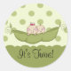 Cute It's Twins Baby sticker featuring a Sweet Little Pea Pod with a baby twin girls on a green polka dotted background. Perfect sticker for baby favors or invitation envelope seals & twin birth announcements! Matching twin invitations, postage stamps & thank you notes are available in our shop at www.celebrateitinvites.com. ©Jessica Weible