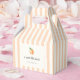 Cute "sweet little peach" theme baby shower favor boxes, featuring a pastel peach striped background and a vintage script.