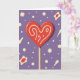 This design shows a cherry-red, heart-shaped lollipop in the center, with creamy white swirls curling across it like frosting. The heart sits on a slim stick and casts a soft shadow, so it looks like it’s floating just a little above the page. Behind it is a periwinkle-purple background with scattered pale yellow dots, tiny starburst shapes, and loose blob-like forms, some with a small red spot in the middle. The lollipop looks sweet and bright, while the background feels calm and dreamy, like a quiet night with confetti drifting by. There isn’t any text on the front, so the heart image does all the talking and leaves plenty of room for your own words inside. It feels meaningful to give because it’s a simple symbol of affection—sweet, direct, and easy to understand ❤️. It works for romance or close friendship, especially when you want to say “I’m thinking of you” without making it complicated 🥰. Hope it helps you share your Valentine’s Day sentiments.