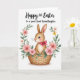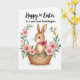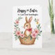 This design shows a long-eared bunny 🐰 nestled cozily in a warm brown woven basket, its fawn-colored fur and tiny whiskers drawn with soft detail. The bunny’s dark, shiny eyes and blush-pink cheeks give it a tender, friendly look, like it’s quietly sharing a sweet moment with someone close. A bright fuchsia bow tied around its neck adds a romantic touch, like a little gift ribbon meant for a dear friend. Surrounding the basket is a floral wreath in a watercolor style, filled with leafy greens and blossoms in soft pink, creamy white, and pale yellow 🌷. Near the top, a short greeting appears in flowing lettering, centered above the wreath in a dark ink tone that stands out against the light background. Gentle lighting and painterly textures keep the scene soft and springlike, with the basket’s earthy tones balancing the delicate flowers. The wreath forms an oval frame around the bunny, with clusters of petals and small leaves overlapping the border in a light, airy pattern.