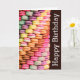 A tower of colorful macarons displayed artfully in a bakery window. The front says Happy Birthday, the inside text says Hope your birthday is so sweet it makes you dizzy. You can personalize it with your own words if desired. This is a fun card to give to someone who has a love of this meringue confection.