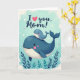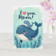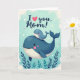 This card features two stylized blue marine animals, a larger adult carrying a smaller youngster on its back, their curved bodies close together like a gentle hug. Both wear wide, kind smiles with soft pink blush on their cheeks, and pale cream lines along their undersides add subtle texture. The pair seems to share a tender, trusting look that reads like close family affection ❤️. The background is a soft teal with a lightly textured, underwater feel, suggesting calm currents behind them. Small white and pale pink bubble-like circles float around the scene, adding lightness and motion. Near the top, the message “I ❤️ you, Mom!” appears in a flowing, handwritten-style line, with the words in a dark tone and the heart in bright pink. Along the bottom edges, darker teal sea plants frame the scene like a quiet reef border.